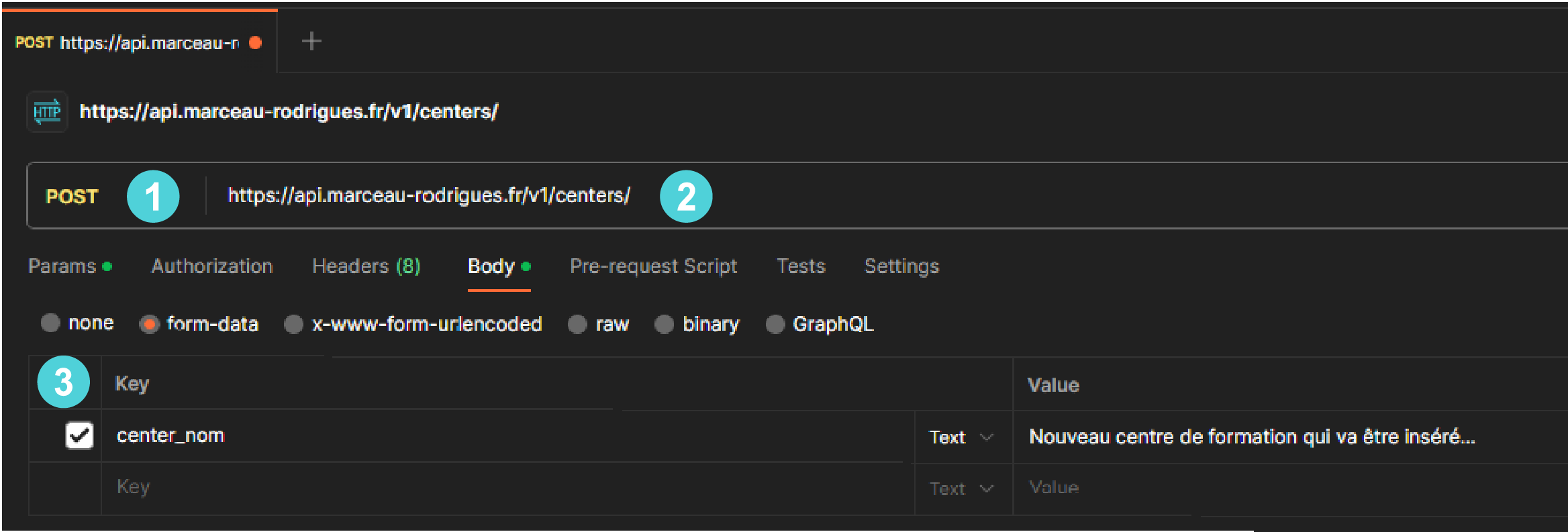 - (3) Les paramètres de la requête si demandés (ex: email, nom, date de naissance, ...).